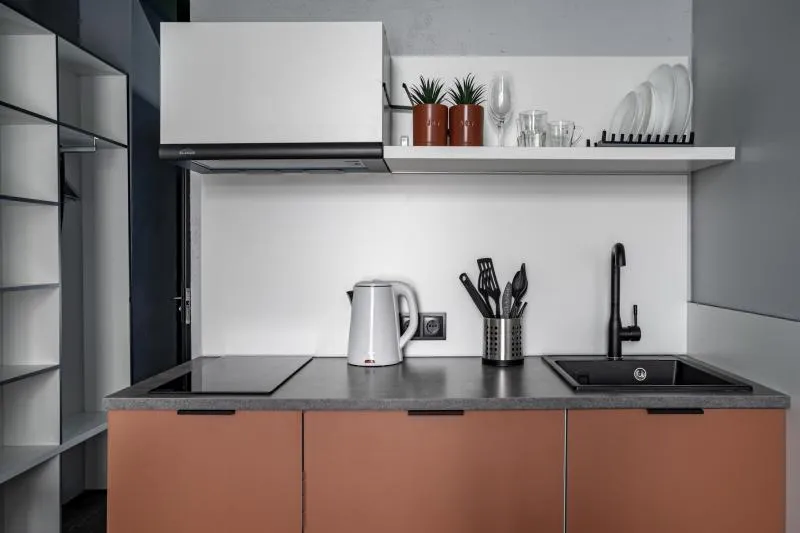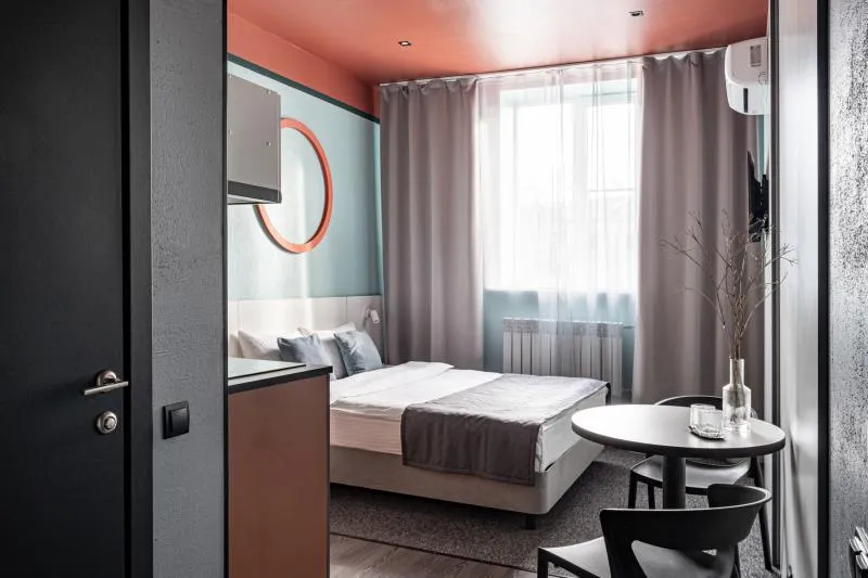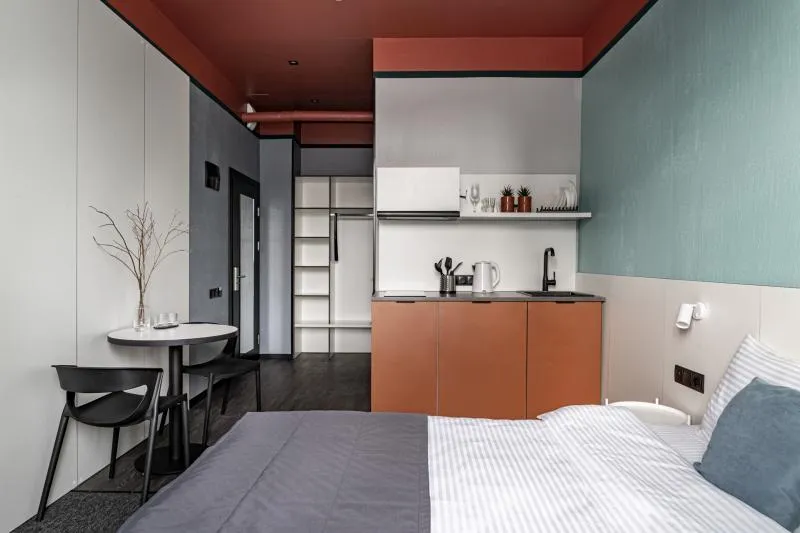 Стильная студия для двоих гостей. Площадь 18 кв.м. Вместимость –2 гостя Двуспальная кровать Бесплатный Wi-Fi Телевизор Мини-кухня с кухонными принадлежностями Душ и туалет
