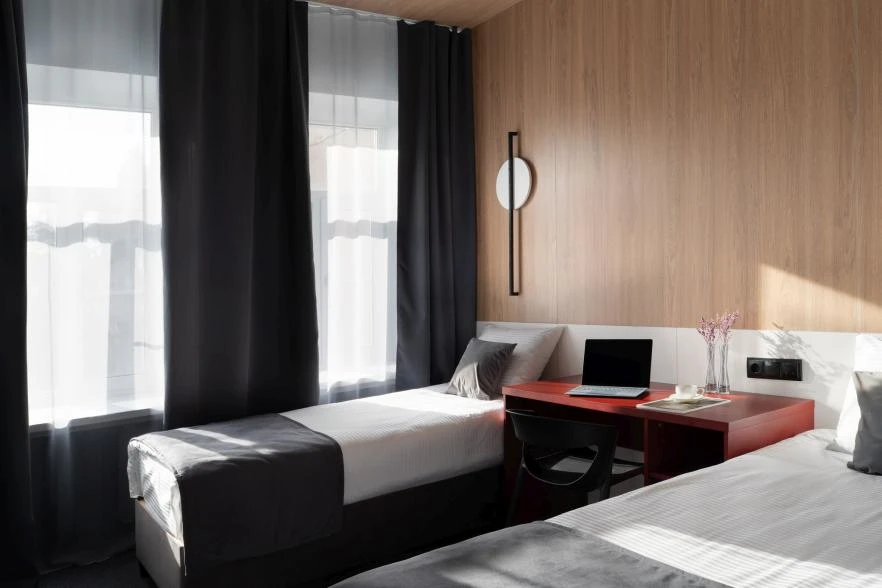 Площадь 14 кв.м. Вместимость – 2 гостя Две односпальные кровати Бесплатный Wi-Fi Телевизор Кондиционер Душ и санузел Комфортная рабочая зона