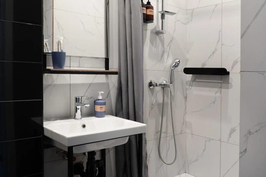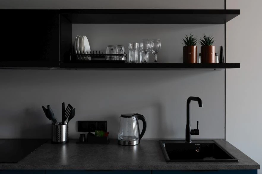 Кухня (холодильник, СВЧ, индукционная плита, чайник, посуда, приборы)